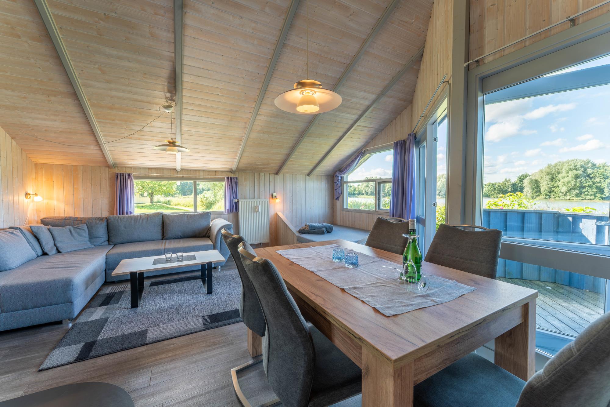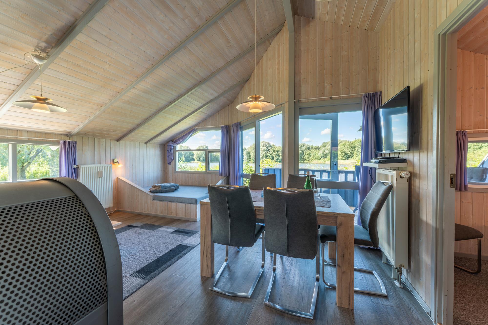 Der offen gehaltene Wohnraum mit Kaminofen und Ausblick auf den See bildet mit der sich anschließender Küche den Mittelpunkt dieses Ferienhauses. Das Wohnzimmer mit Ess-/Sitzbereich verfügt über eine Schlafempore auf die Sie sich gemütlich zurückziehen können. Die Südterrasse mit Gartenmöbeln ist von Ihrem Wohnzimmer zugänglich und geht zum See raus. Genießen Sie hier eine entspannte Urlaubszeit und den einmaligen Ausblick auf den Südsee.