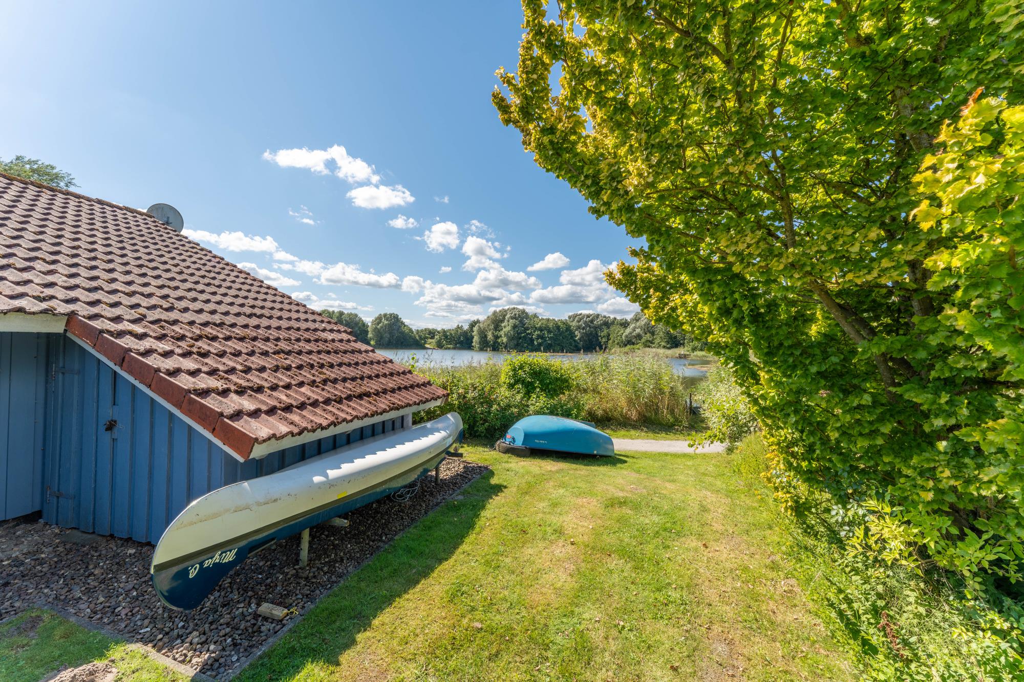 Außenbereich: Gartengrundstück mit teilüberdachter Südterrasse mit Gartenmöbeln und Auflagen, Sonnenschirm, Grill, Ruderboot und Kanu(Benutzung des Bootes auf eigene Gefahr), kleiner Bootsanleger gegenüber des Gartengrundstücks