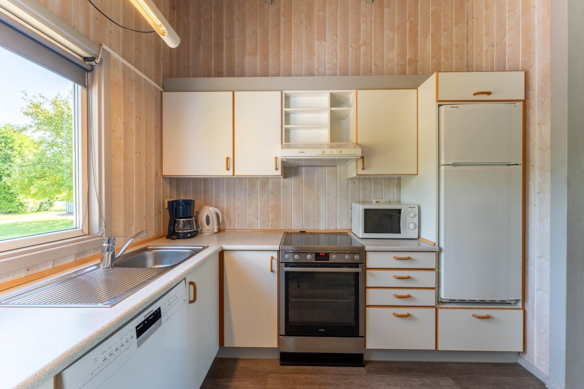 Küche: Designbelag, komplett ausgestattete Küche mit Geschirrspülmaschine, Backofen, Kochfeld, Mikrowelle, Kühlgefrierschrank, Kaffeemaschine, Wasserkocher und Toaster