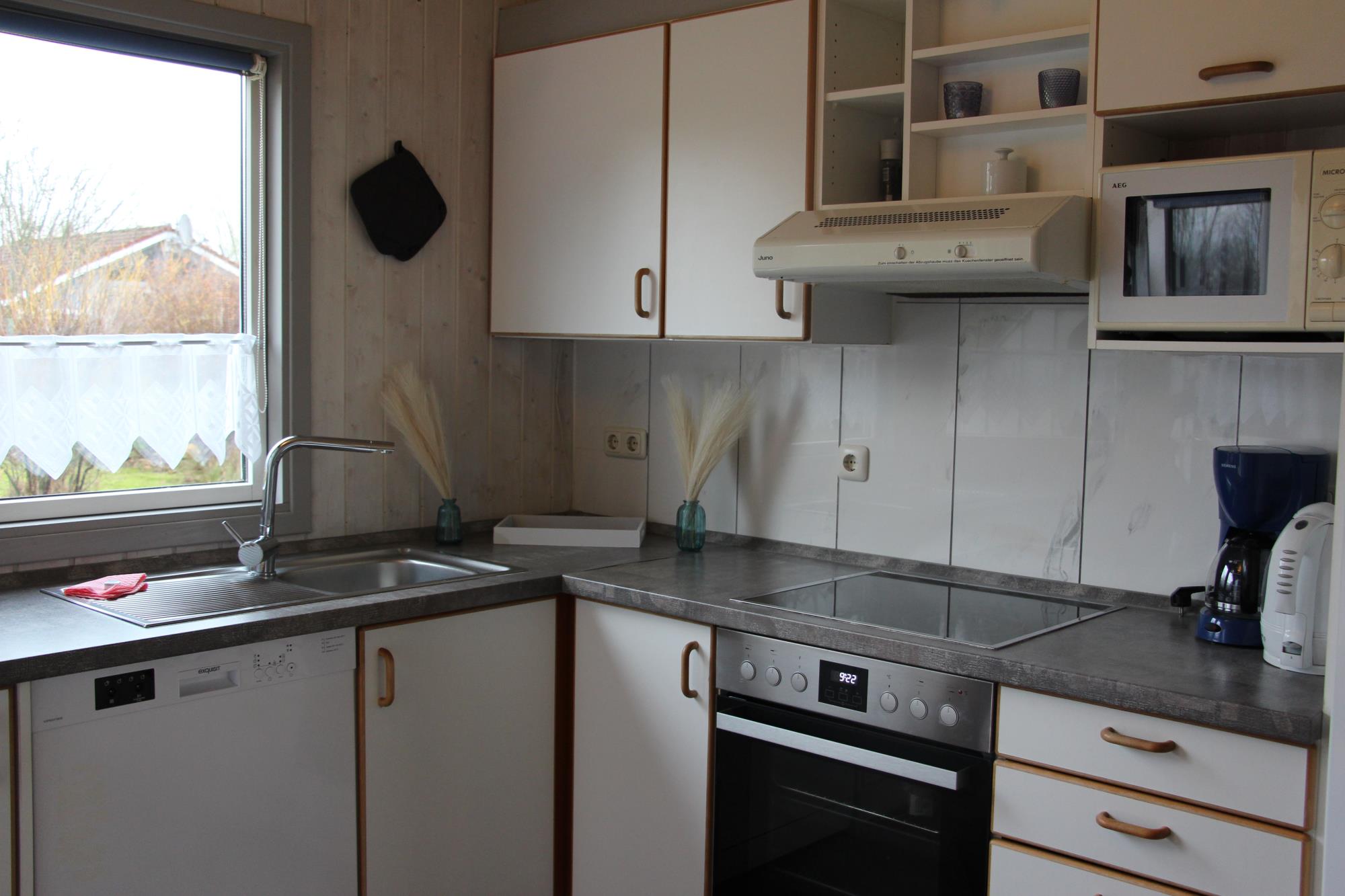 Küche: Laminatboden, komplett ausgestattete Küche mit Geschirrspülmaschine, Backofen, Kochfeld, Mikrowelle, Kühlgefrierschrank, Kaffeemaschine, Wasserkocher und Toaster, Waschmaschine