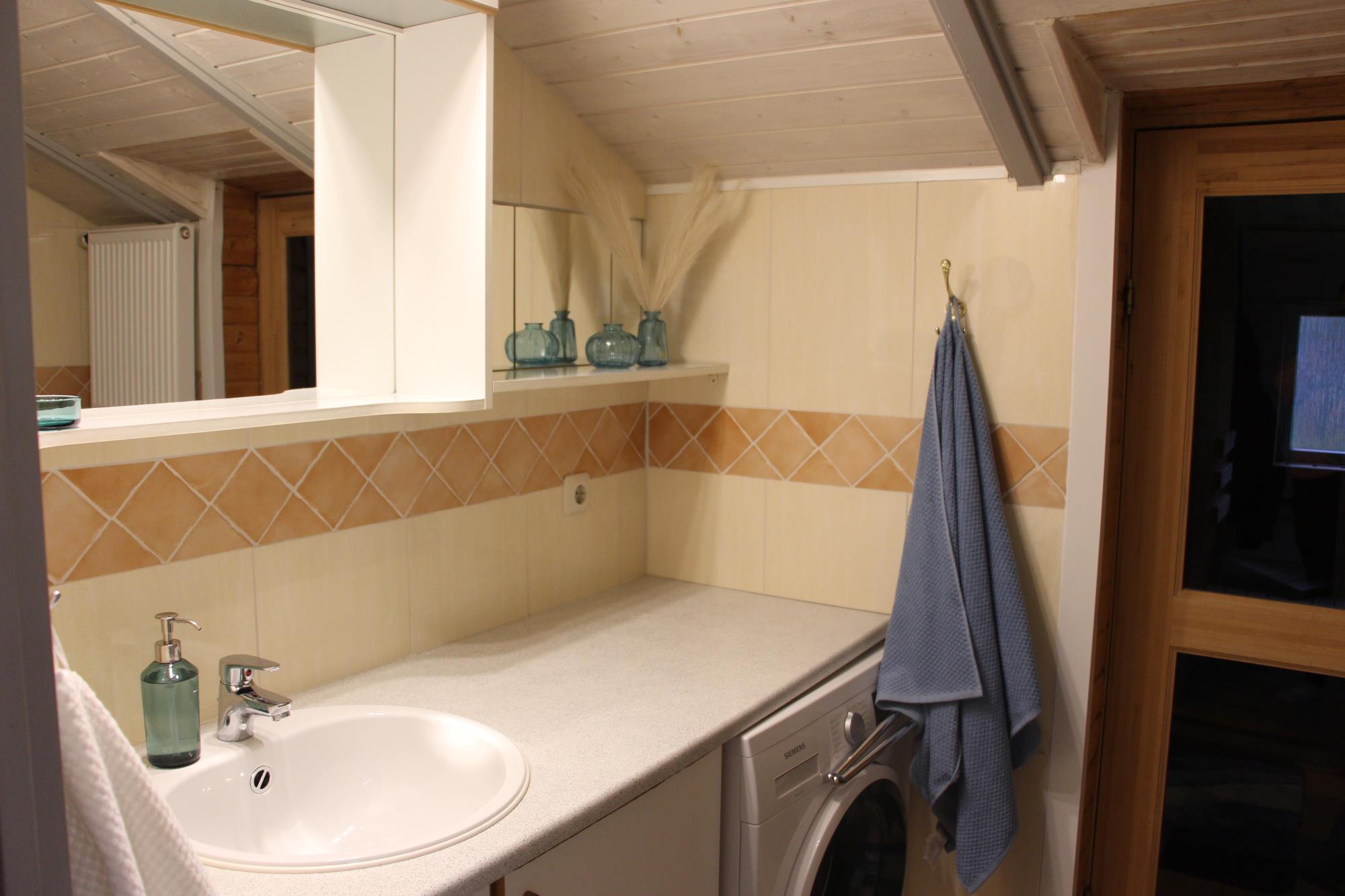 Badezimmer: Fliesenboden, große Sauna, Dusche, Waschtisch und WC