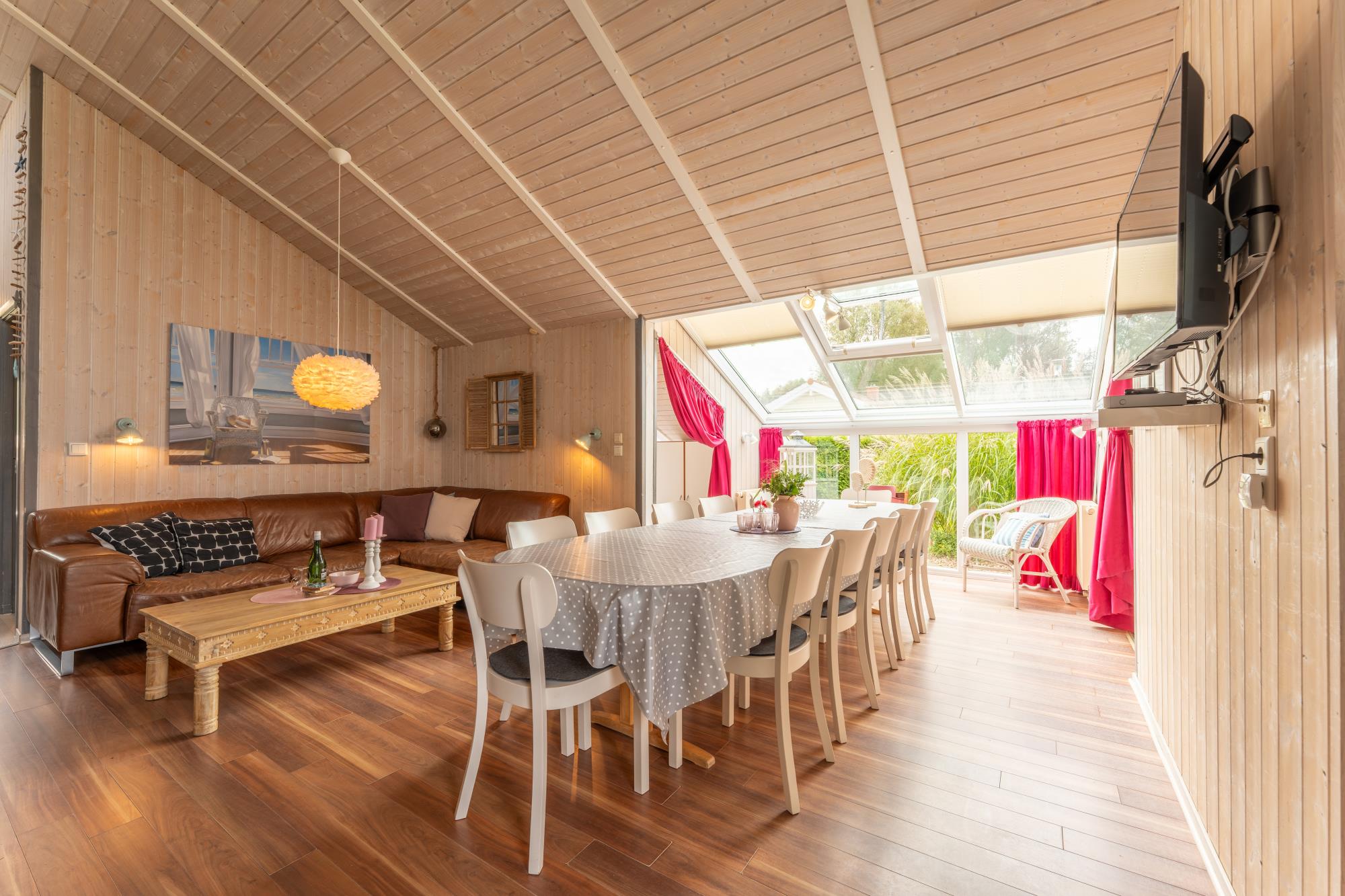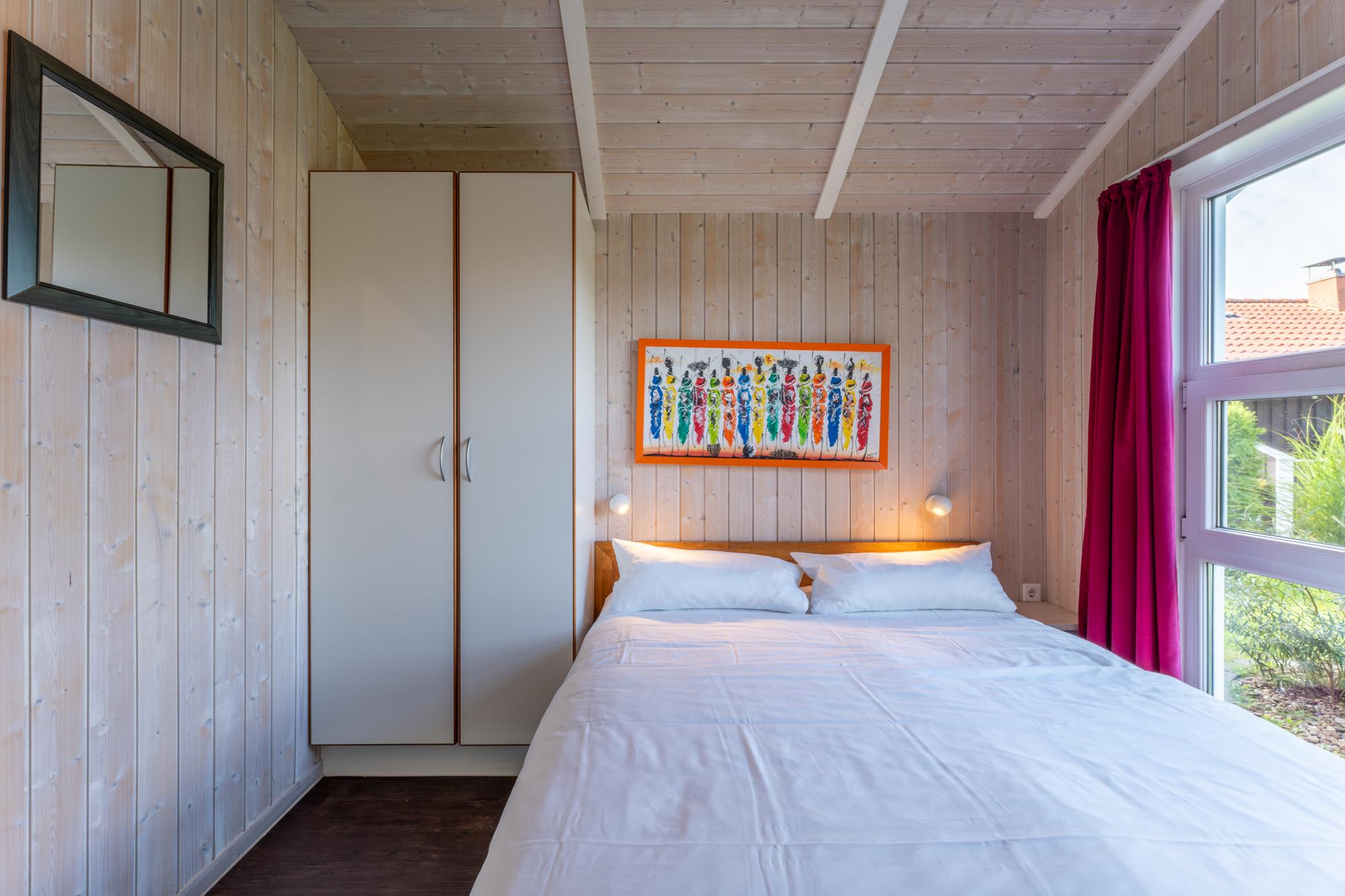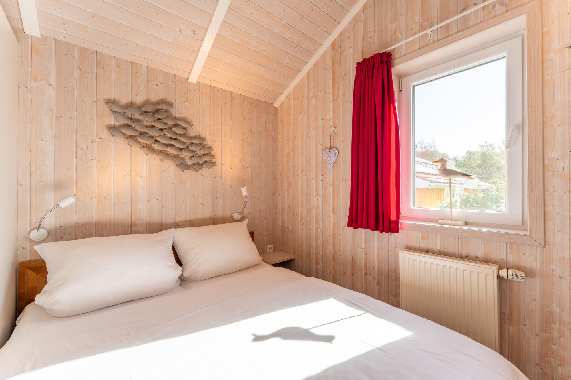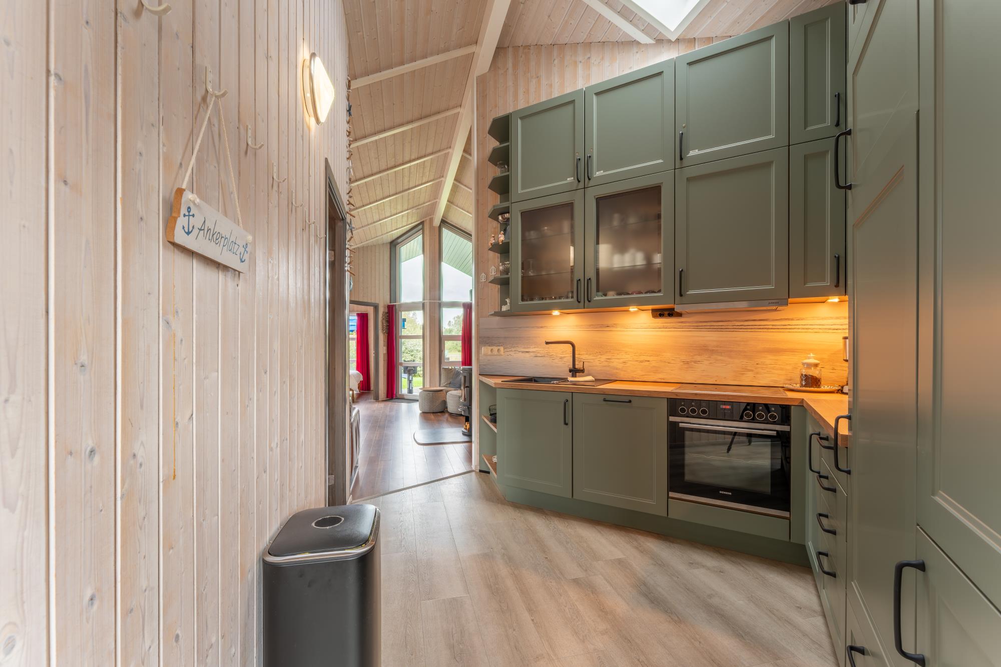 Das Ferienhaus ist 135 qm groß und besitzt 4 Schlafzimmer mit jeweils einem 1,60 m breitem Doppelbett. Ein Schlafzimmer wurde mit einem weiteren Fernseher ausgestattet. Vom Wohn-Esszimmer gehen die beiden Alkoven mit jeweils 2 Betten ab, die insbesondere bei Kindern als „Schlafhöhlen“ beliebt sind. Mit einer Matratzenbreite von 80 cm bieten sie aber auch Erwachsenen einen Platz zum Schlafen. Über dem Esstisch befindet sich ein sonniges Atelierfenster, das den Wohnraum mit viel Helligkeit versorgt. Eine Sitzgruppe lädt zum Verweilen und Fernsehen ein. Weitere Sessel befinden sich direkt neben der Terrassentür mit herrlichem Blick auf die Wasserlandschaft. Der Kaminofen sorgt an kalten Tagen für behagliche Wärme. Insgesamt ist das Haus für 12 Personen ausgestattet und für ganz kleine Gäste steht ein Kinderstuhl von Stokke und ein Kinderreisebettchen zur Verfügung. Die Küche grenzt direkt an den Wohn-/Essbereich. Sie ist u.a. mit einem Herd, einer Spülmaschine, einem Wasserkocher, einer Kaffeemaschine und einer Mikrowelle ausgestattet.