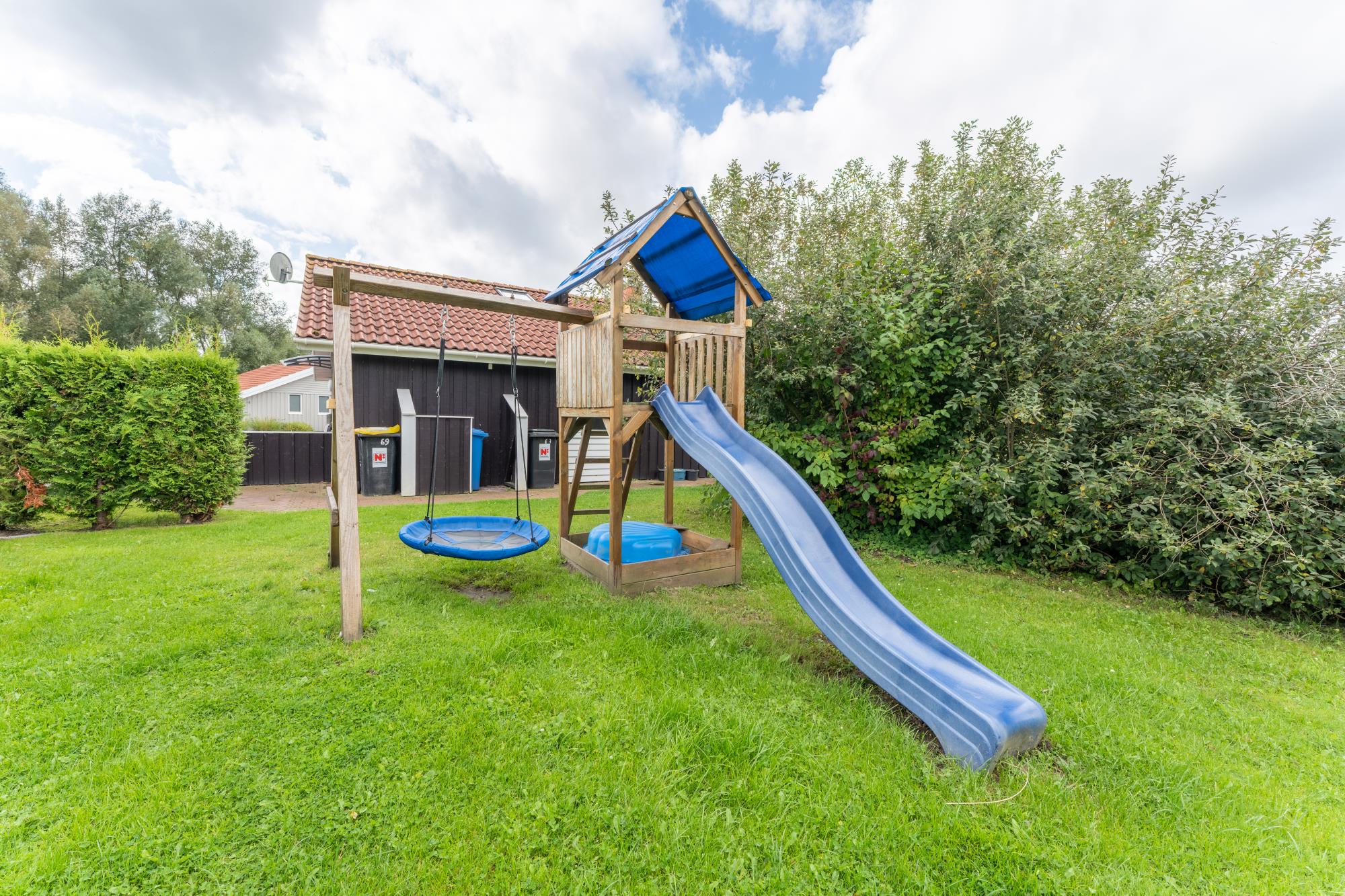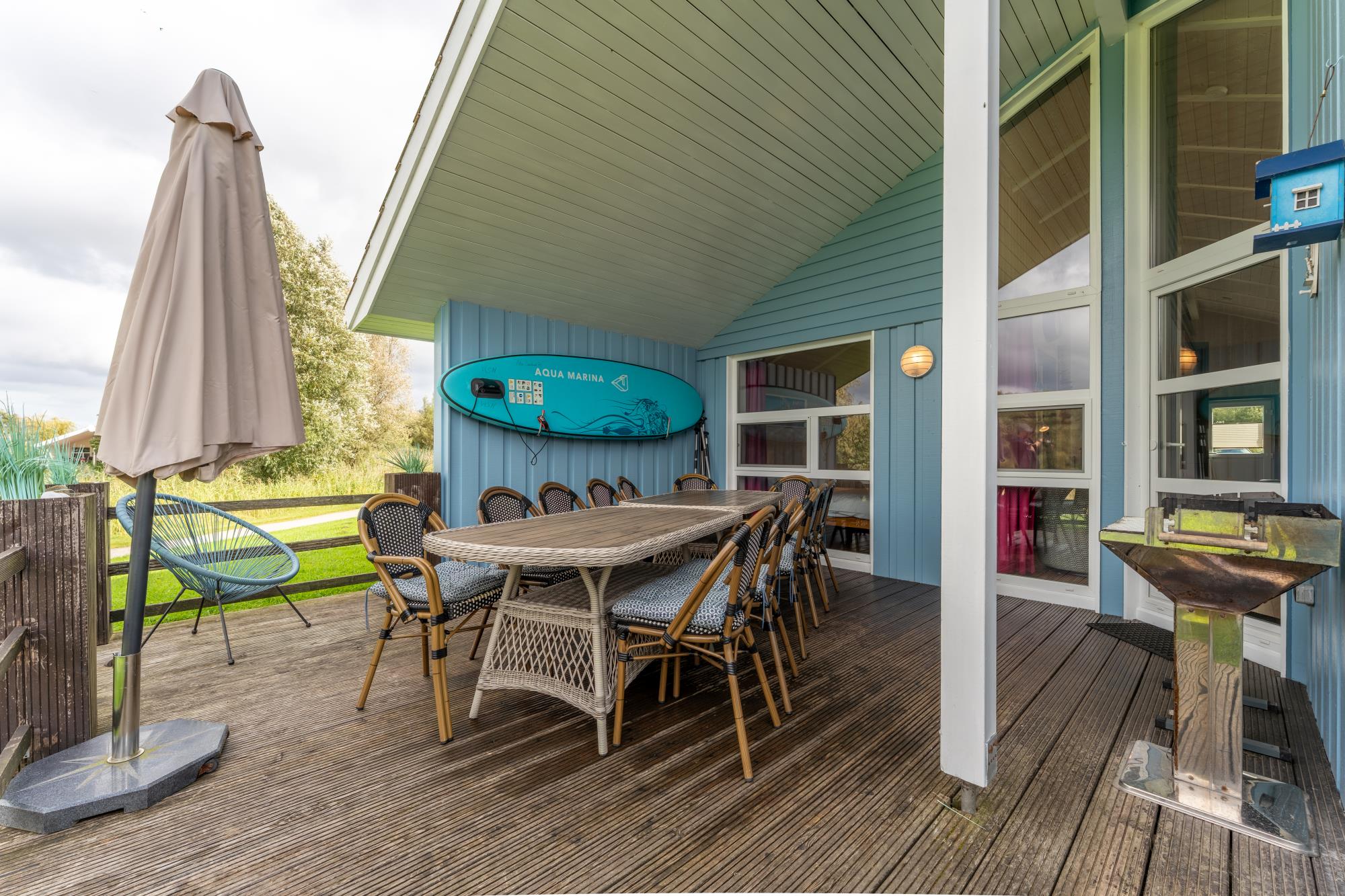 Außenbereich: Gartengrundstück mit teilüberdachter Terrasse, Gartenmöbeln und Auflagen, Sonnenliegen, Sonnenschirm, Grill, Schaukelturm und Sandmuschel, Kanu (Benutzung des Kanus auf eigene Gefahr)