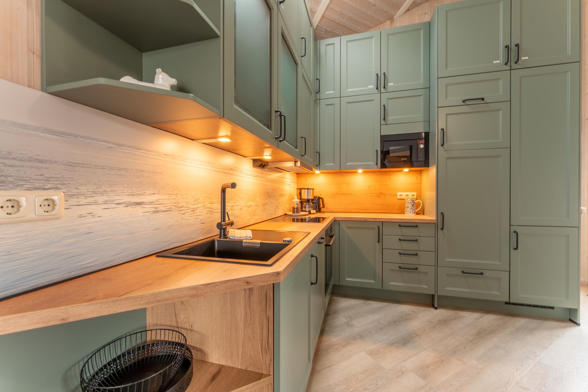 Küche: Laminatboden, komplett ausgestattete Küche mit Geschirrspülmaschine, Backofen, Kochfeld, Mikrowelle, Kühlgefrierschrank, Kaffeemaschine, Wasserkocher und Toaster, Geräteschrank mit Staubsauger, Wischer, Besen, Handfeger und Kehrblech