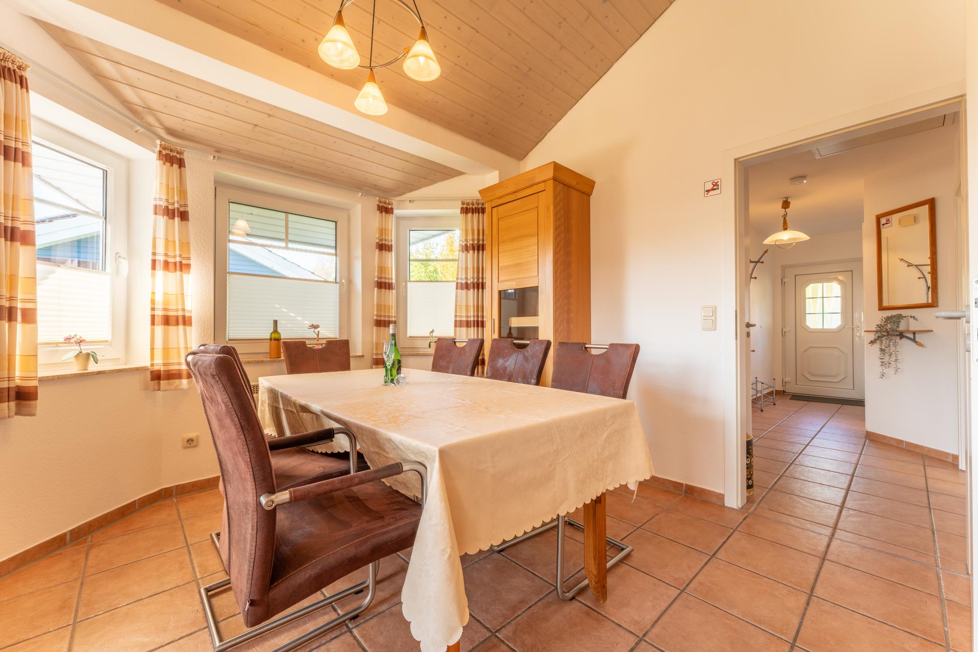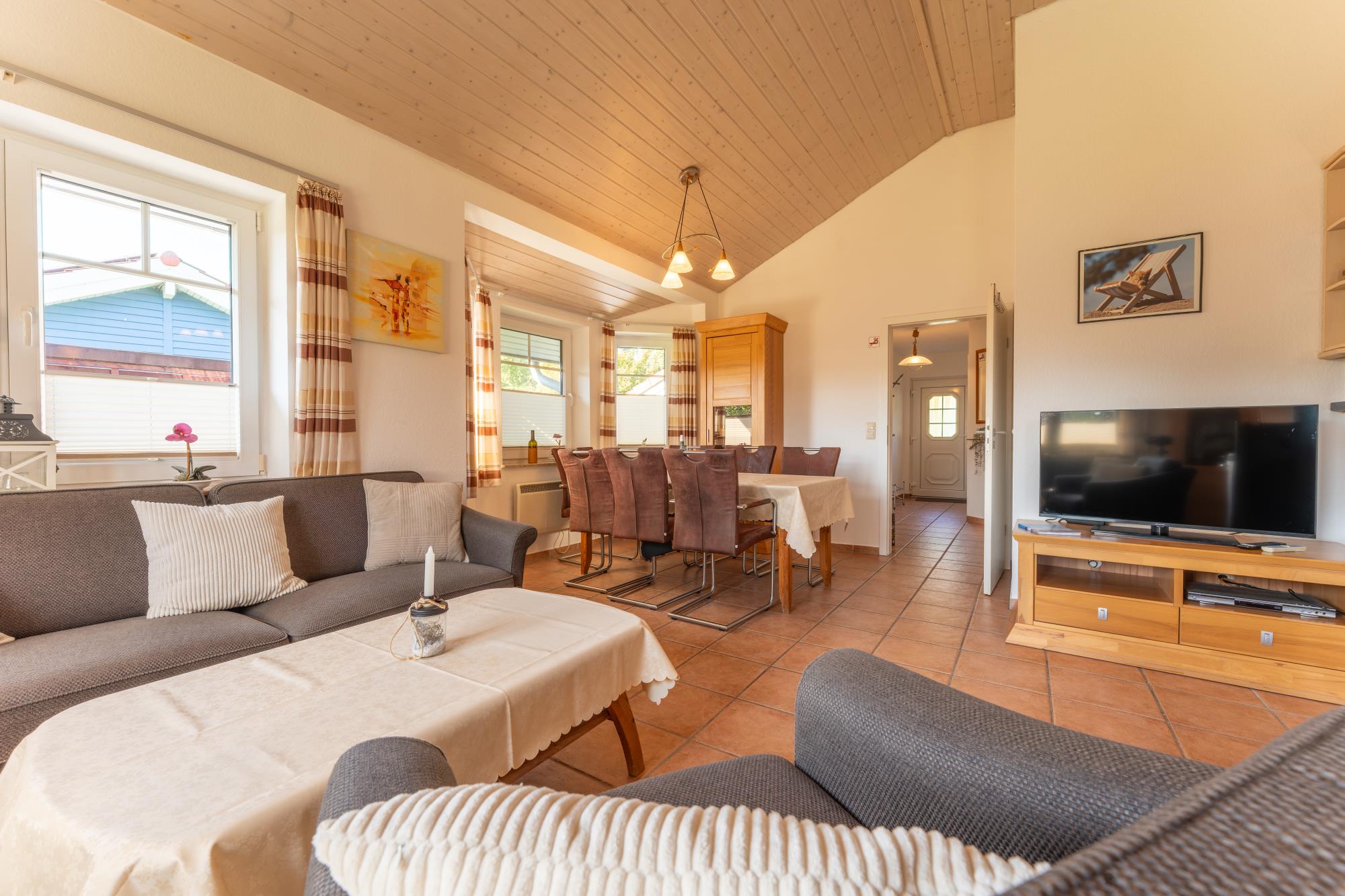 Wohnzimmer: Fliesenboden, Kaminofen, Sitzgruppe, Ess-/Sitzbereich, Fernseher, DVD-Player und Stereoanlage, Kinderhochstuhl, W-Lan Zugang