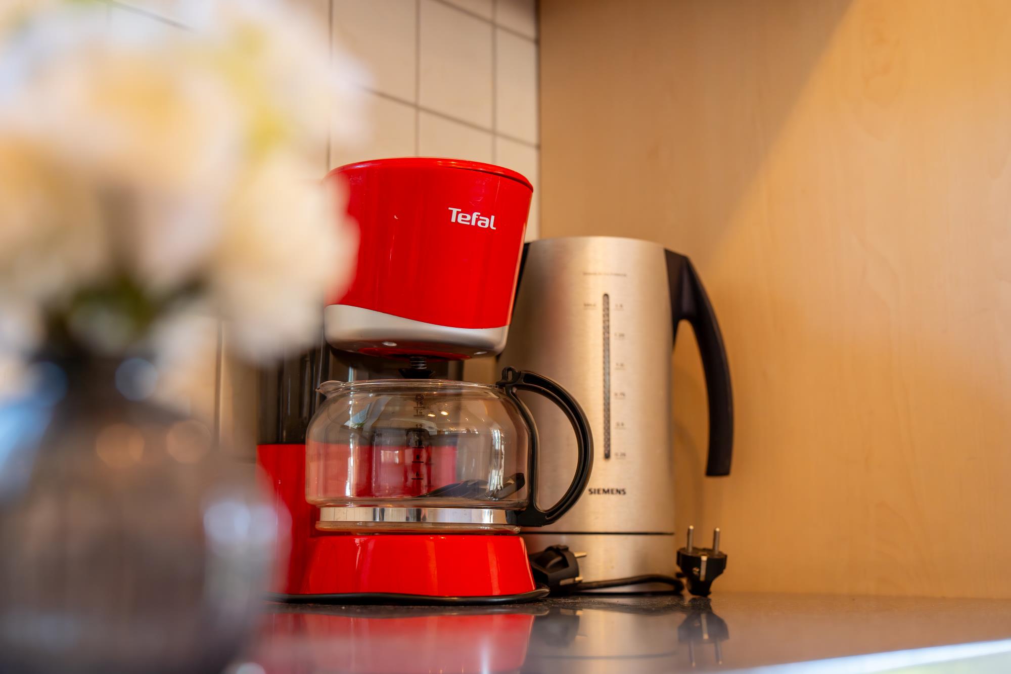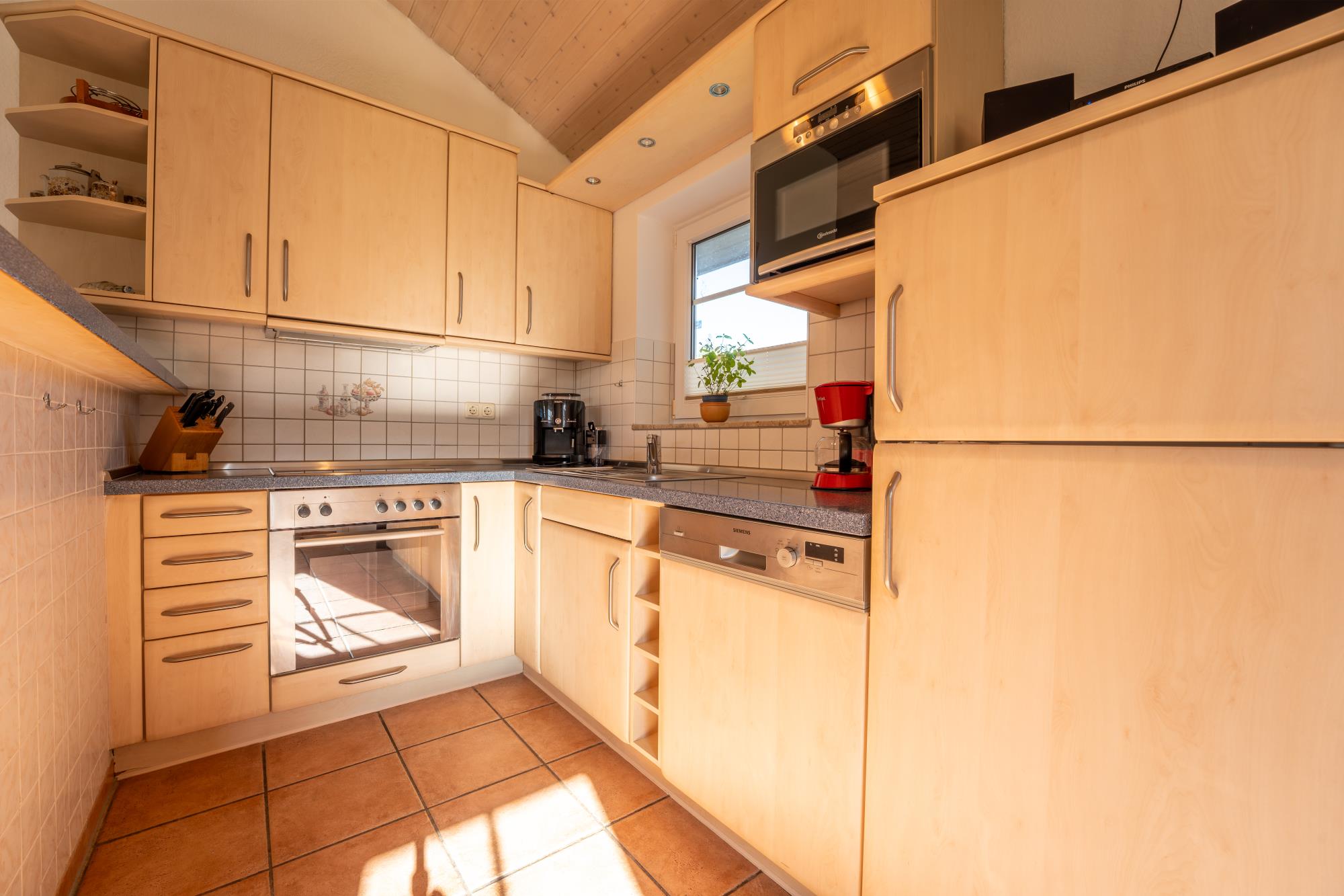 Küche: Fliesenboden, komplett ausgestattete Küche mit Geschirrspülmaschine, Backofen, Cerankochfeld, Mikrowelle, Kühlgefrierschrank, Kaffeemaschine, Wasserkocher und Toaster, Geräteschrank mit Staubsauger, Wischer, Besen, Handfeger und Kehrblech