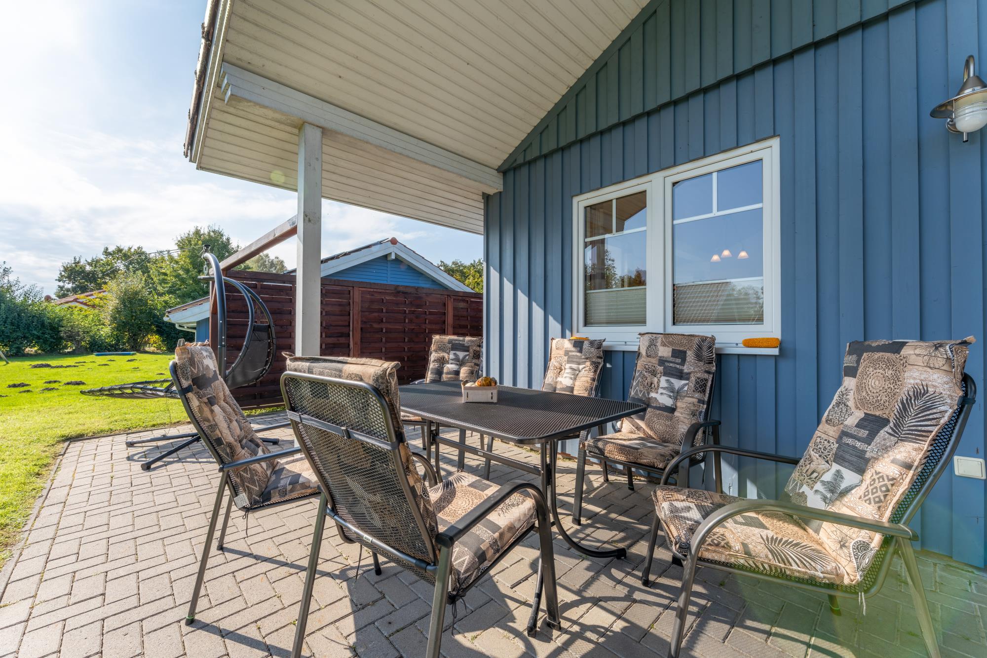 Außenbereich: großes Gartengrundstück mit teilüberdachter Terrasse mit Gartenmöbeln und Auflagen, Sonnenliegen, Sonnenschirm, Grill, Kinderschaukel und Sandmuschel, Kanu (Benutzung des Kanus auf eigene Gefahr), geräumiger Abstellraum mit der Möglichkeit Fahrräder einzuschließen, Fahrradständer