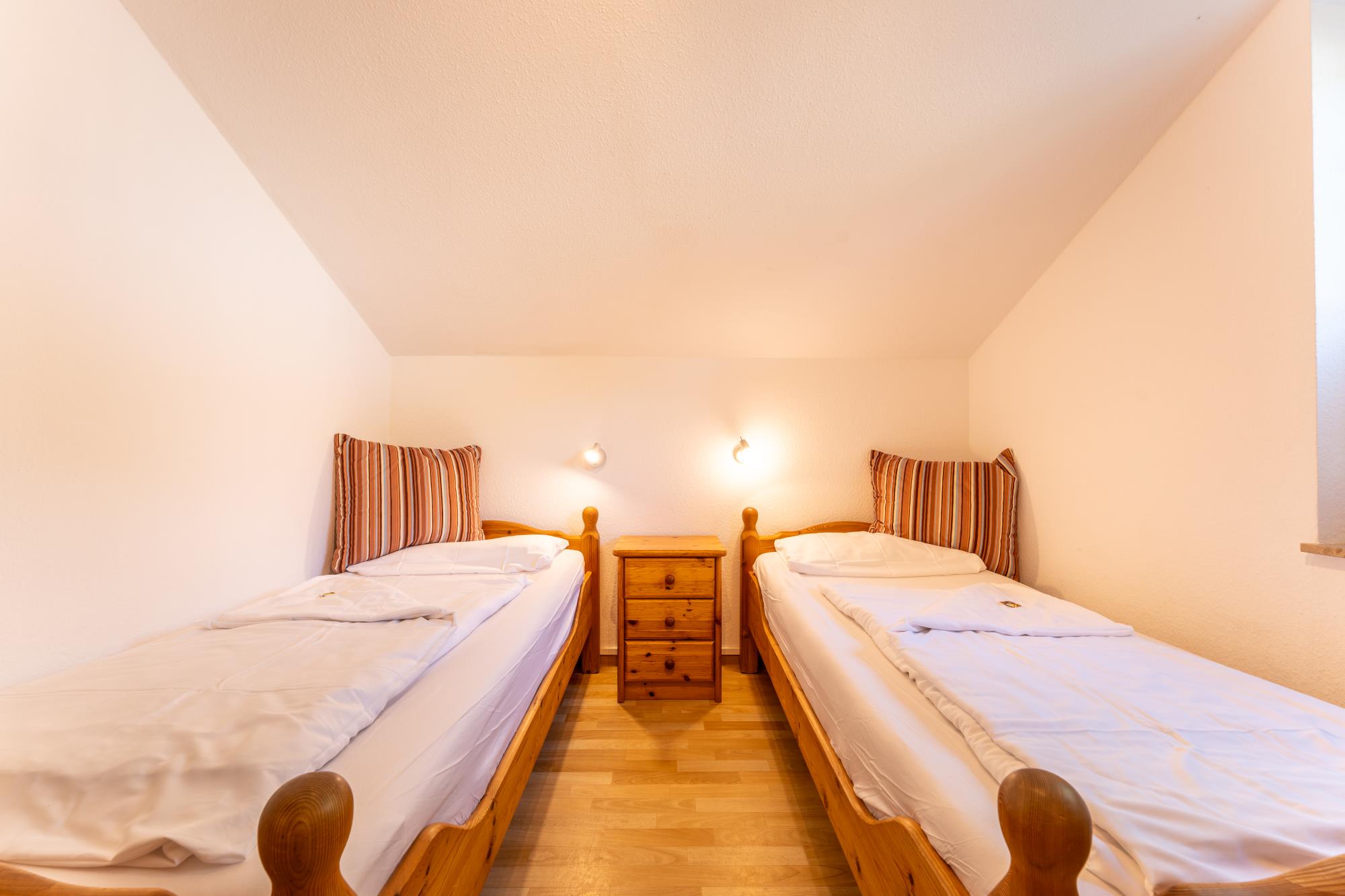 Schlafzimmer: Laminatboden, zwei Schlafzimmer mit einem Doppelbett und ein Schlafzimmer mit zwei Einzelbetten, Kinderreisebett
