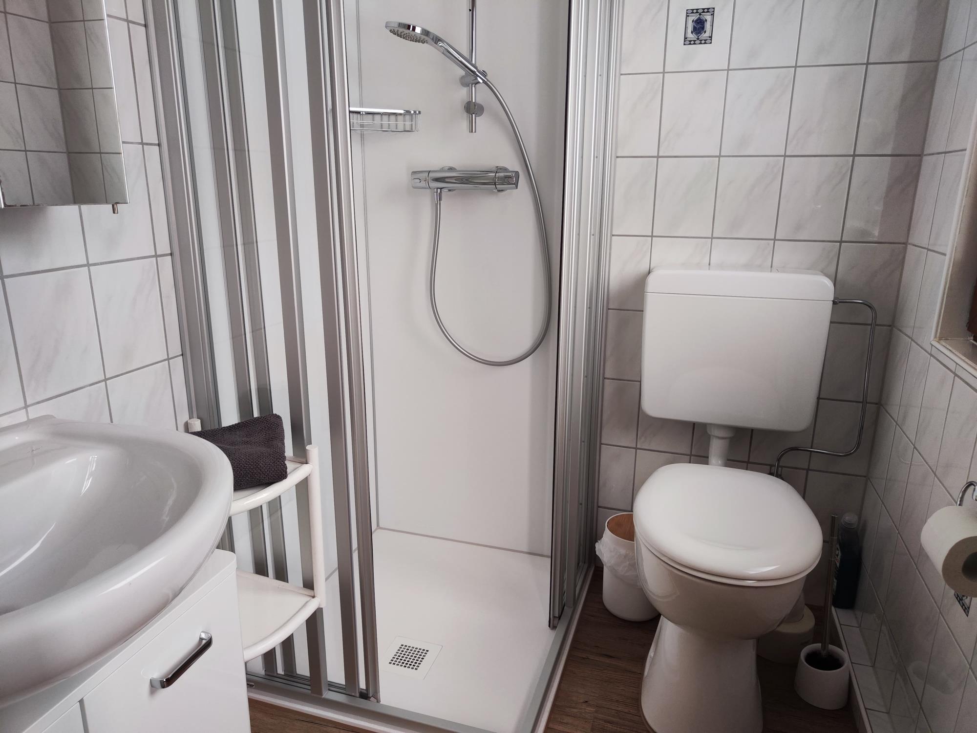 Badezimmer: Fliesenboden, Dusche, Waschtisch, WC und Waschmaschine
