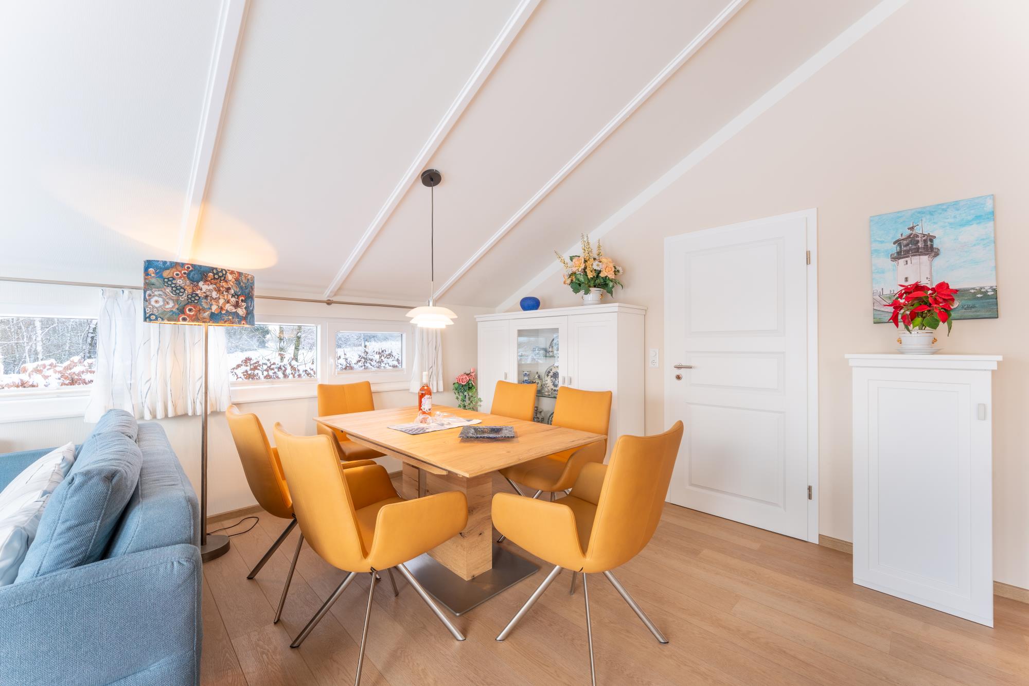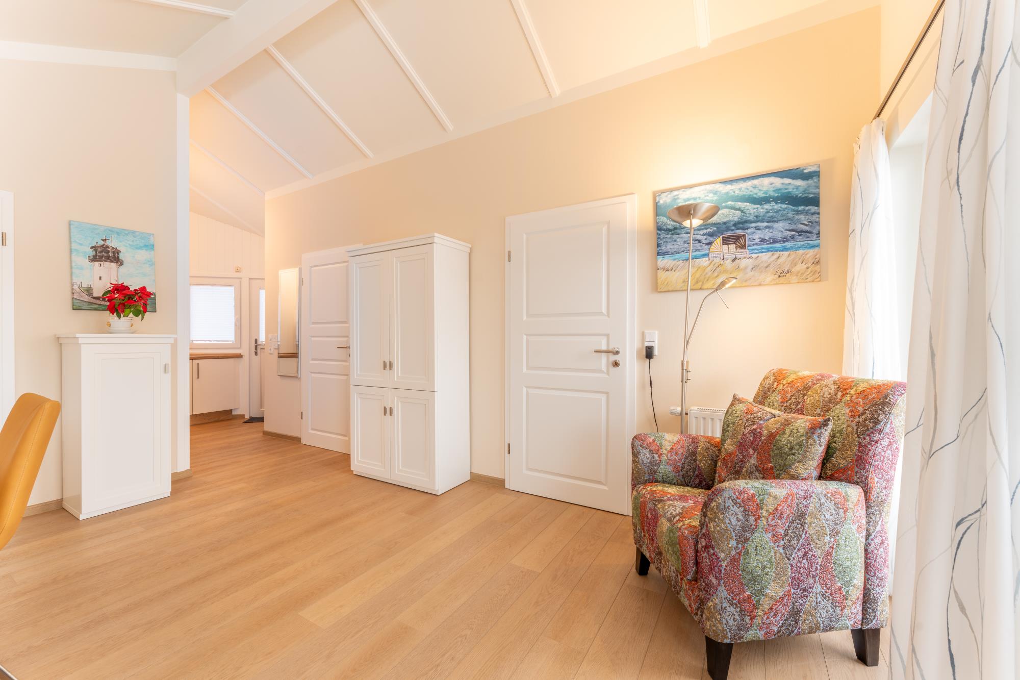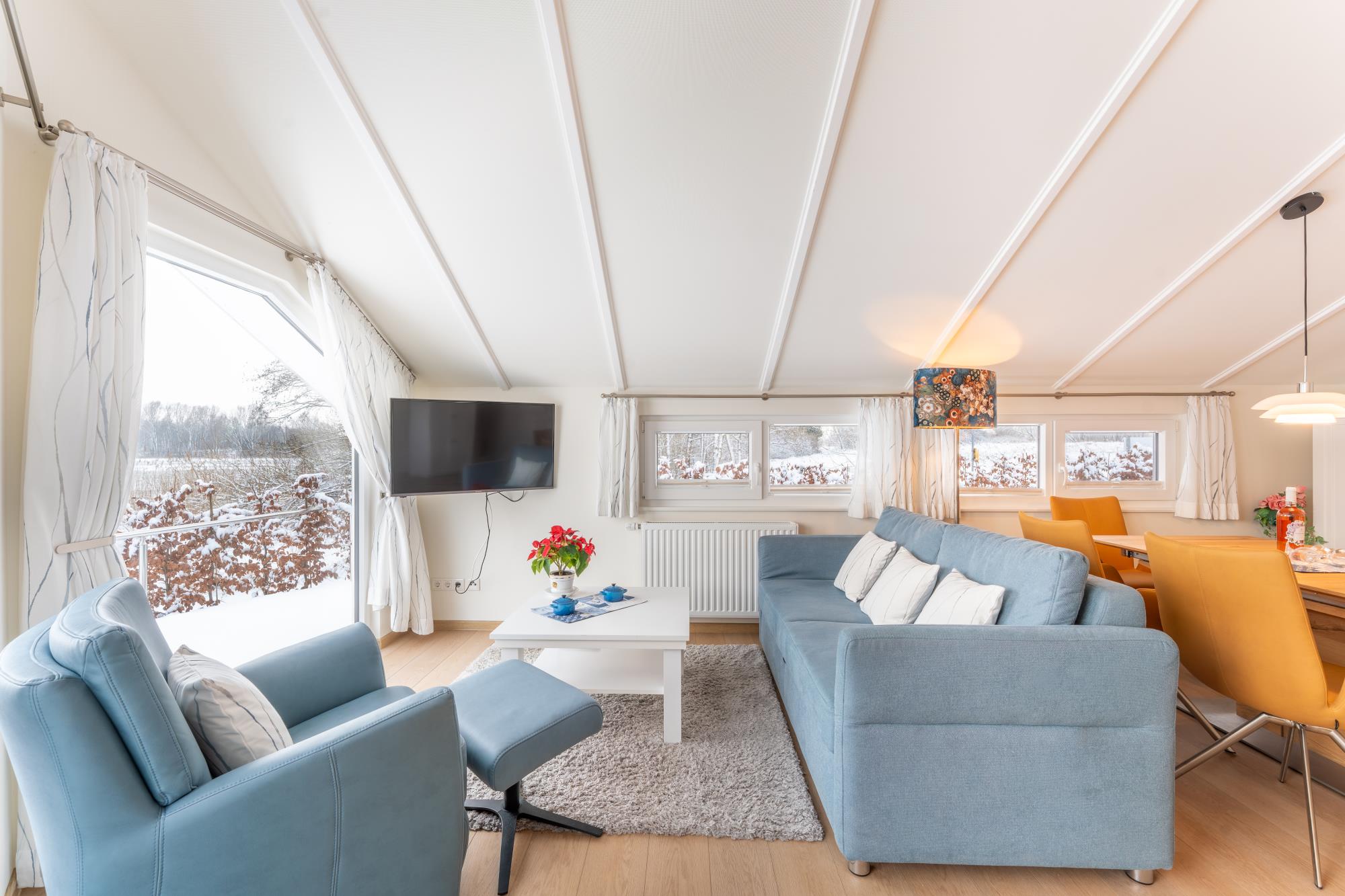 Der offen gehaltene Wohnraum bildet mit der sich anschließenden Küche den zentralen Mittelpunkt dieses Ferienhauses. Die Terrasse mit Gartenmöbeln ist von Ihrem Wohnzimmer zugänglich und geht zum See raus. Zu diesem Haus gehört eine weitere kleine Terrasse die sich im Eingangsbereich befindet. Dieses Haus ist ebenerdig und barrierefrei auch im Außenbereich.