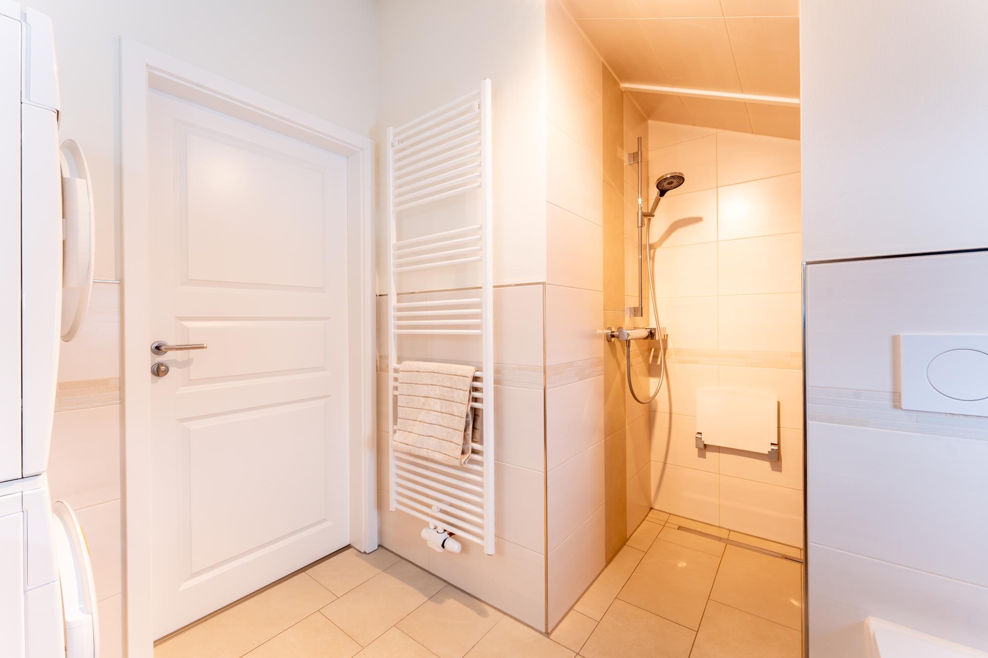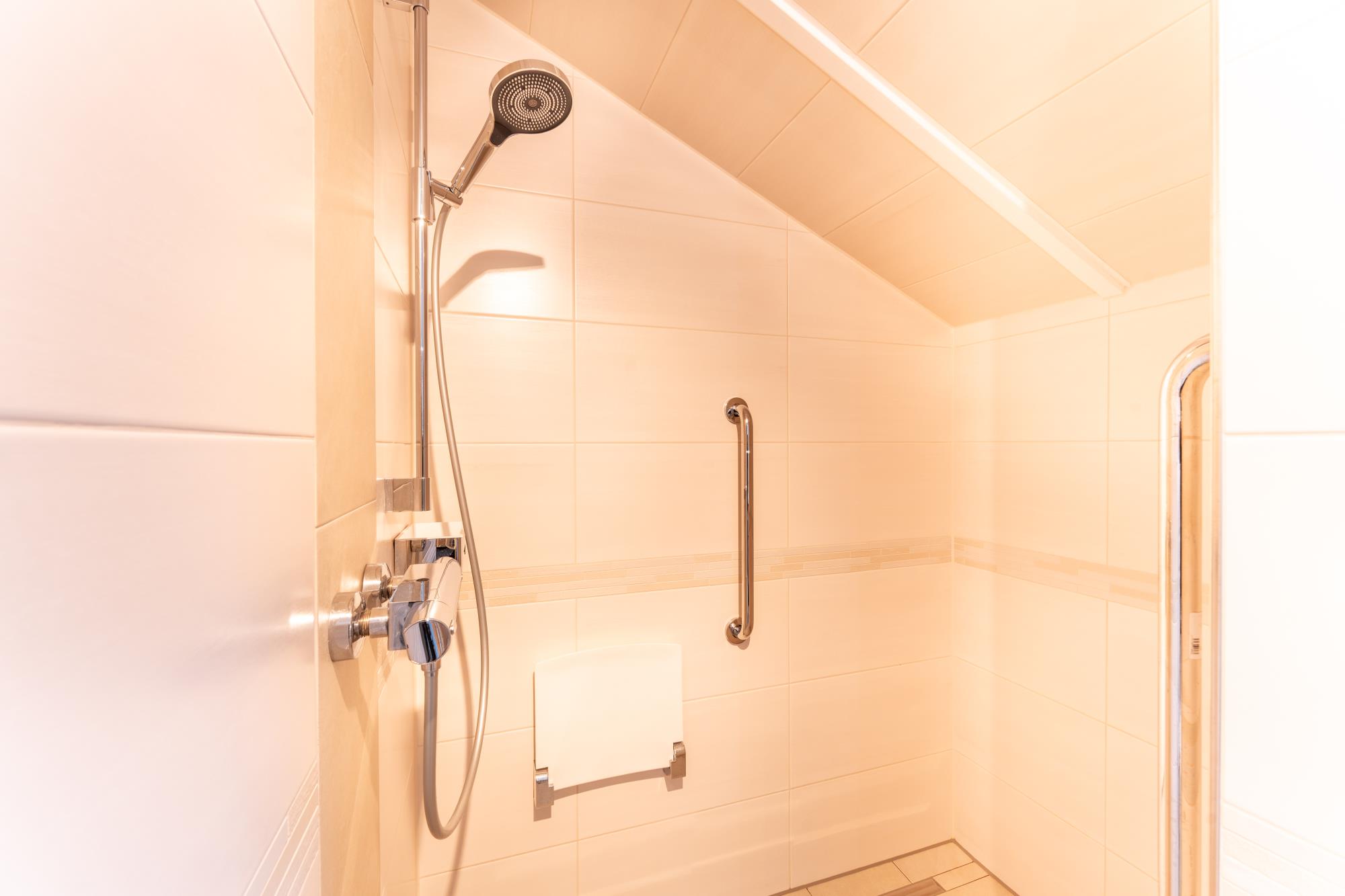 Badezimmer: Fliesenboden, ebenerdige Dusche mit Sitz und Halterungen, Waschtisch und WC, Waschmaschine