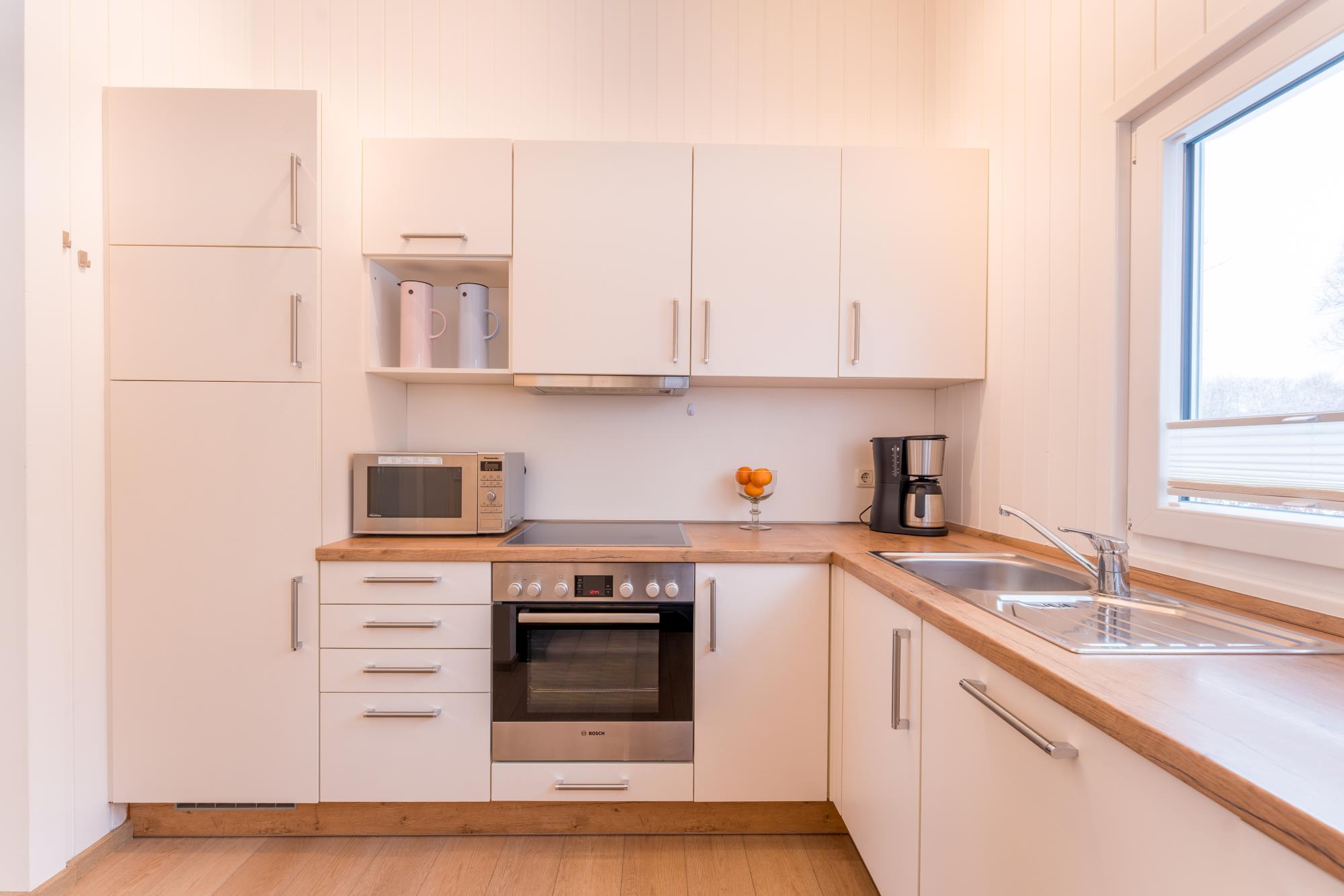Küche: Laminatboden, komplett ausgestattete Küche mit Geschirrspülmaschine, Backofen, Kochfeld, Mikrowelle, Kühlgefrierschrank, Kaffeemaschine, Wasserkocher und Toaster
