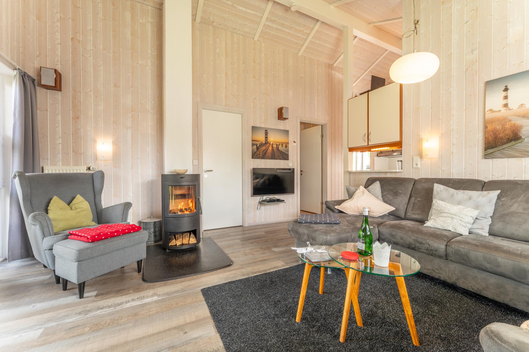 Es erwartet Sie ein modernes und freundliches Wohnzimmer mit Kaminofen.