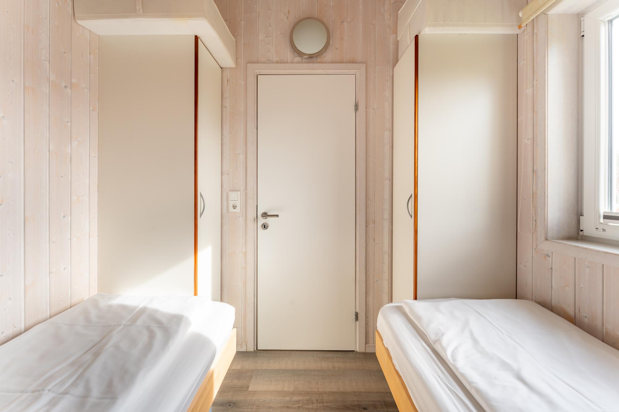 Kinderzimmer: Laminat, zwei Einzelbetten, Kinderreisebett, Fliegengitter Verdunkelungsrollo