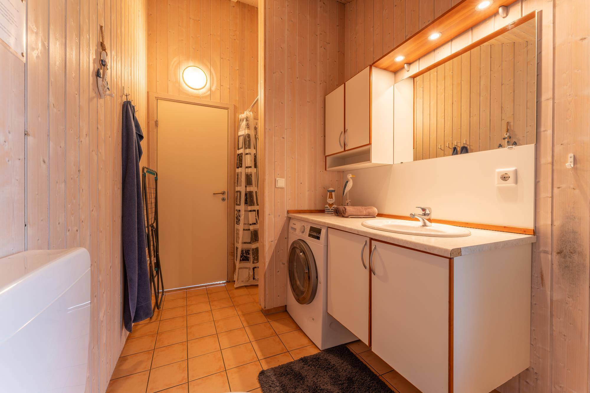 Badezimmer: Fliesenboden, Fußbodenheizung, Sauna, Dusche, Whirlpool, Waschtisch, WC und Waschtrockner